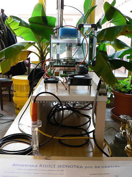 Pohled na řídící jednotku zabudovanou do modelového akvária. Opravdu vše se dalo demostrovat: dávkování CO2, regulace denního i nočního osvětlení, řízení ventilátorů atd.